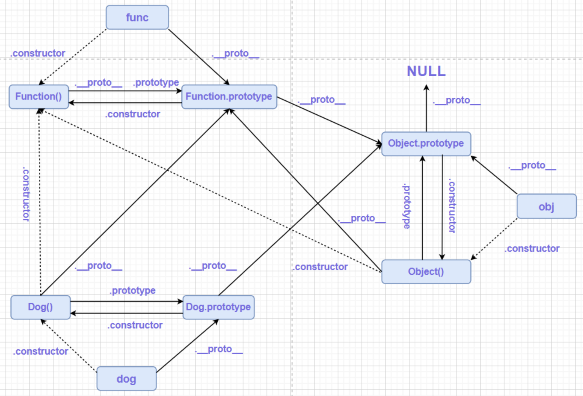 prototype、__proto__、constructor三者的关系,现在假设一种情况:让原型对象等于另一个构造函数的实例,结果会怎么样呢?显然,此时的原型对象将包含一个指向另一个原型的指针,相应地,另一个原型中也包含着一个指向另一个构造函数的指针。