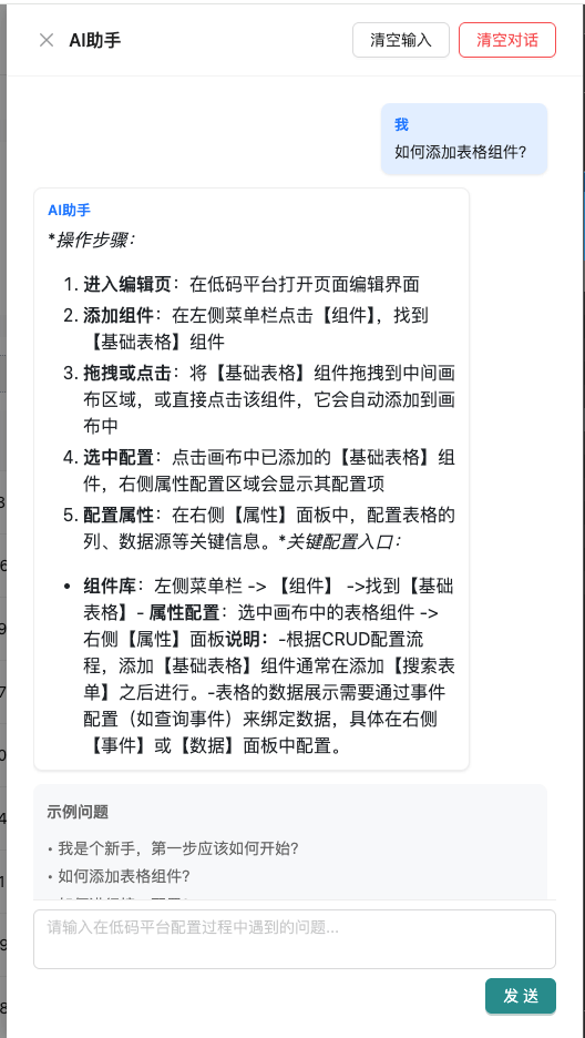 目前该AI助手的前端交互形式是在低码配置页面有个按钮,点击可呼出如下的对话面板,用户可输入遇到的问题进行查询: