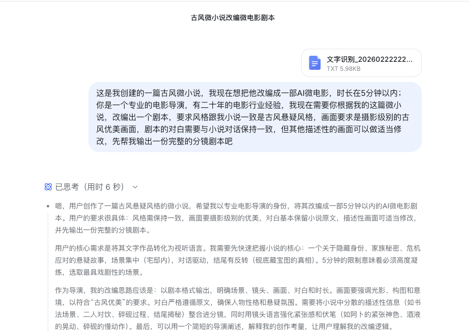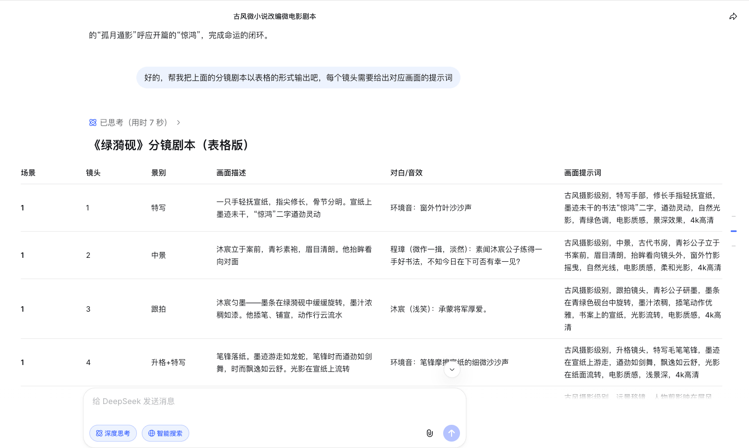 我首先是直接把我的小说转换为txt文件,然后扔给DeepSeek,让它生成分镜剧本: