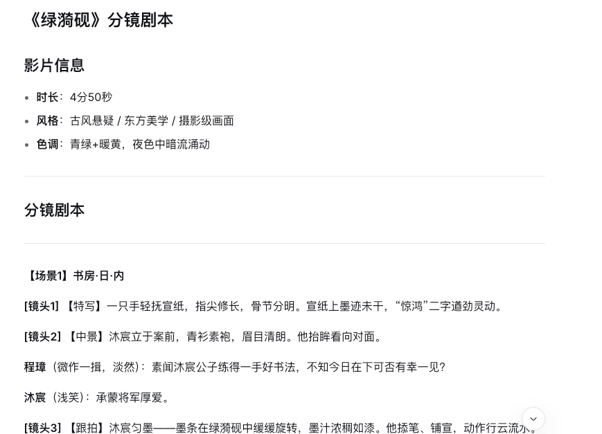 上面的AI短片是基于我大学时写的一篇微小说《绿漪砚》改编的,如果没有现成的文本故事,可以让AI根据你输入的主题,输出一个简单的故事结构,再根据这个故事结构生成完整的故事。