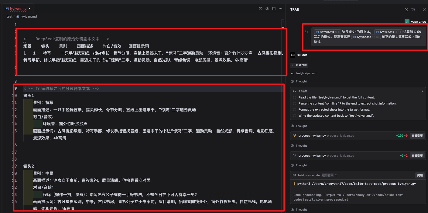 - 然后就把生成的分镜剧本复制下来,保存到我本地(DeepSeek为什么没有一键下载功能😂...)。这里它输出的分镜剧本结构不太符合我的预期,我需要转换下格式,所以我又用