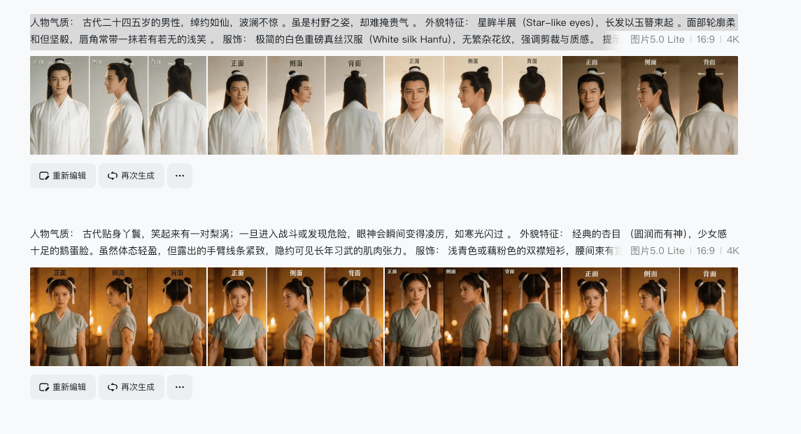 - 之后就开始复制人物提示词,打开即梦 (opens new window),选择图片生成,输入人物提示词,生成人物形象图;我这里以【沐宸】为例: