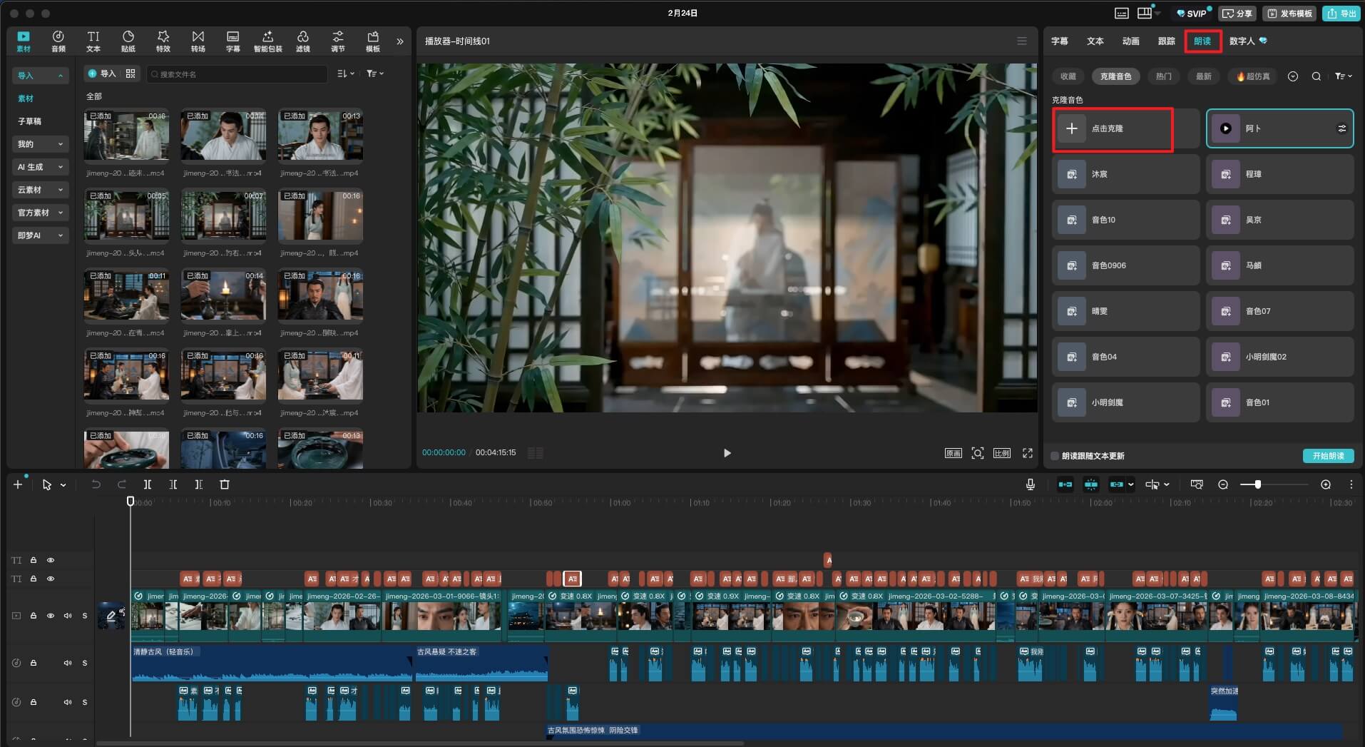 接下来是最重要的人物配音问题,生成的AI视频里面会默认有旁白,你可以选择自己满意的视频人物声音,先单独导入剪映,导出音频文件就得到该人物的声音;之后选择剪映的克隆音色,导入声音文件,就能得到该人物的克隆声音了。