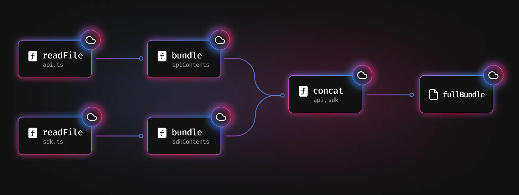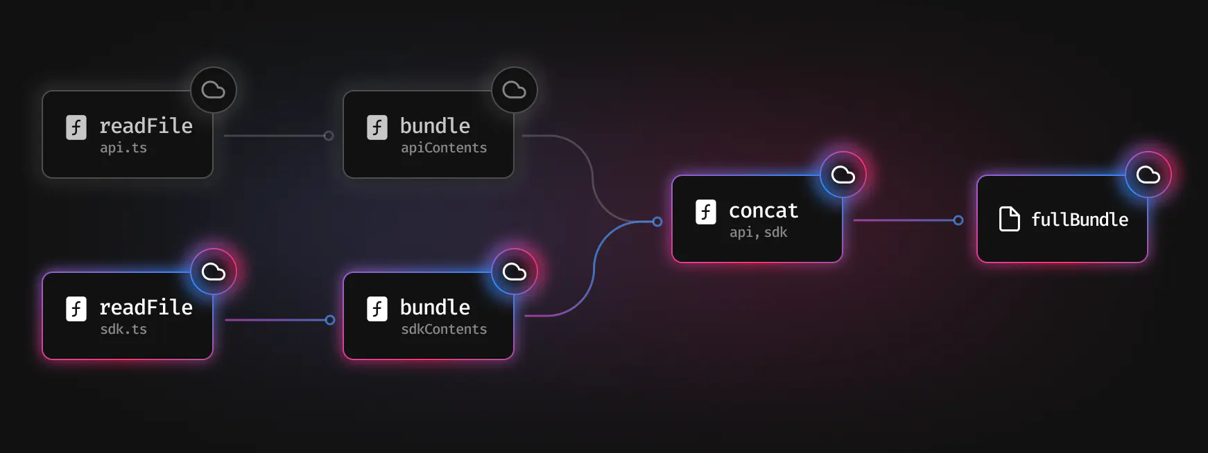 我们首先调用readFile来读取两个文件,api.ts和sdk.ts。然后将这些文件捆绑在一起,拼接在一起,最终得到fullBundle。所有这些函数调用的结果都会保存在缓存中以供以后使用。