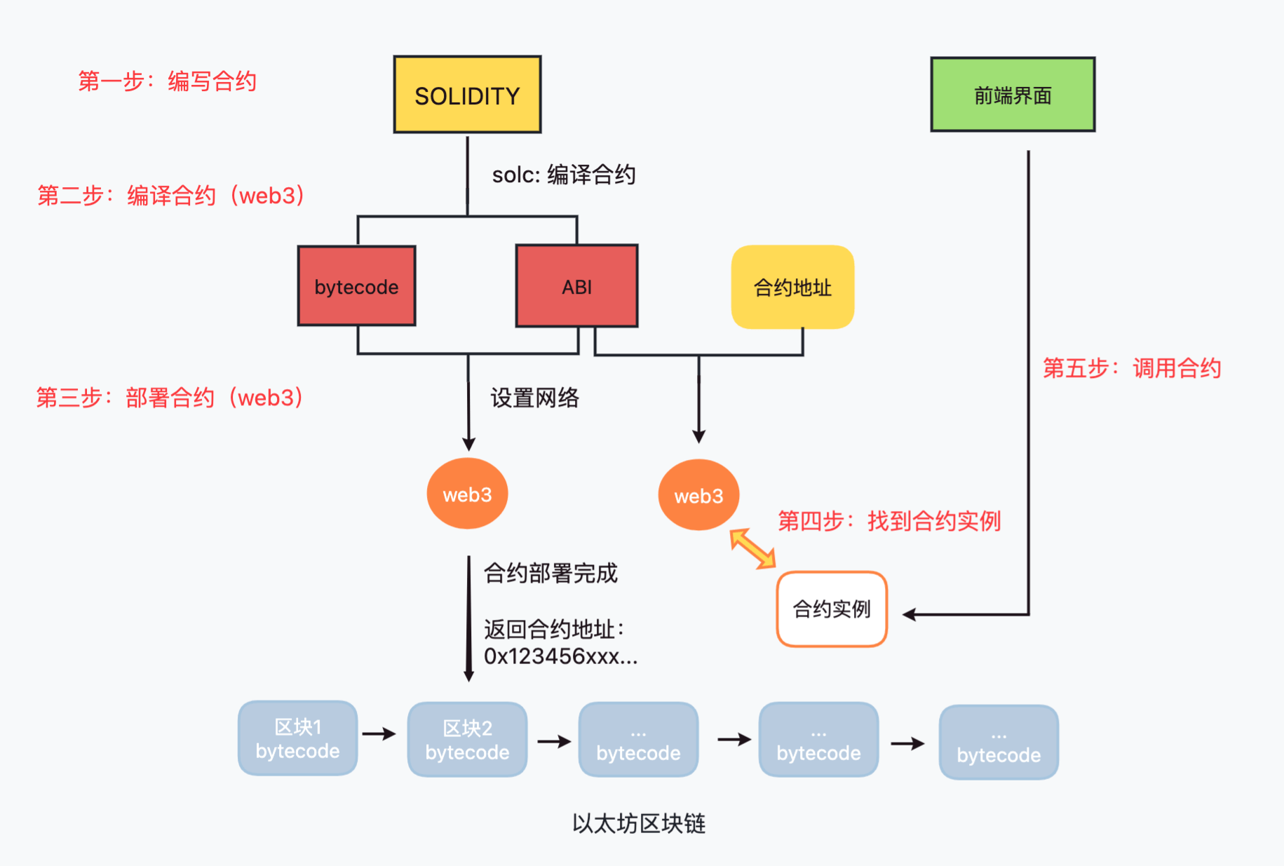这里画了一张从合约编写、编译、部署、调用的流程图~