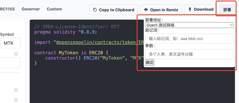 - 前端在页面上增加一个【部署】按钮,然后用户输入助记词,选择部署网络,输入合约入参(选填);之后调服务端的部署接口,传入合约源码信息和上述参数,等服务端返回部署结果;