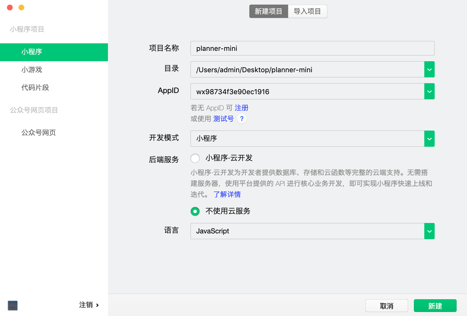 自定义项目名称,选择项目目录(若无则在该目录下新建一个文件夹),输入小程序的AppID,先选择【不使用云服务】,点击创建;创建成功之后则进入到如下界面: