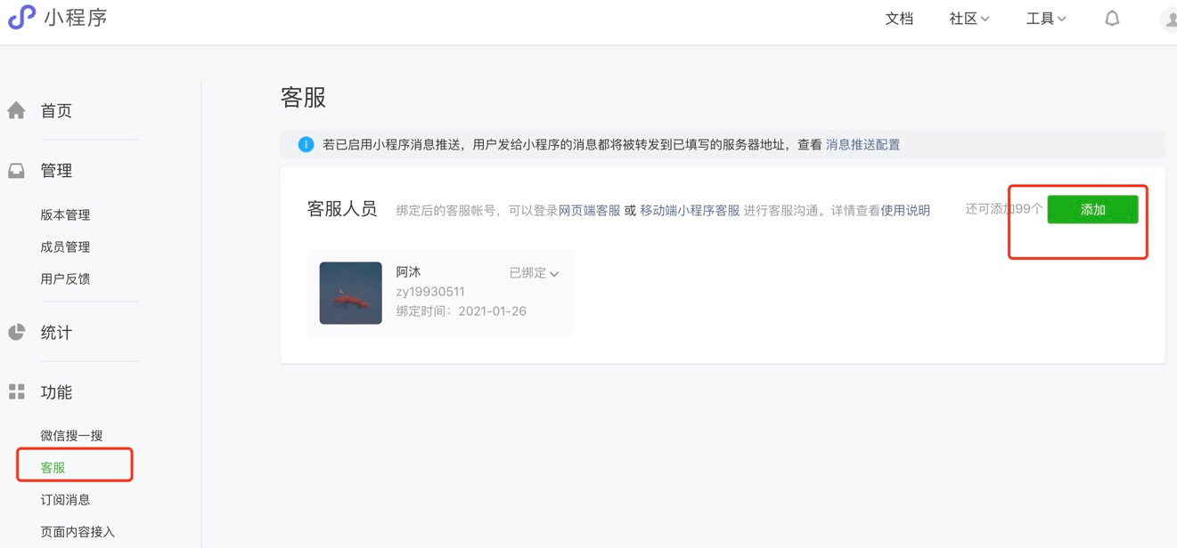 <button type="primary" open-type="contact">客服</button>;开发者平台:功能 》 客服,添加微信号;这样点击按钮就自动跳转