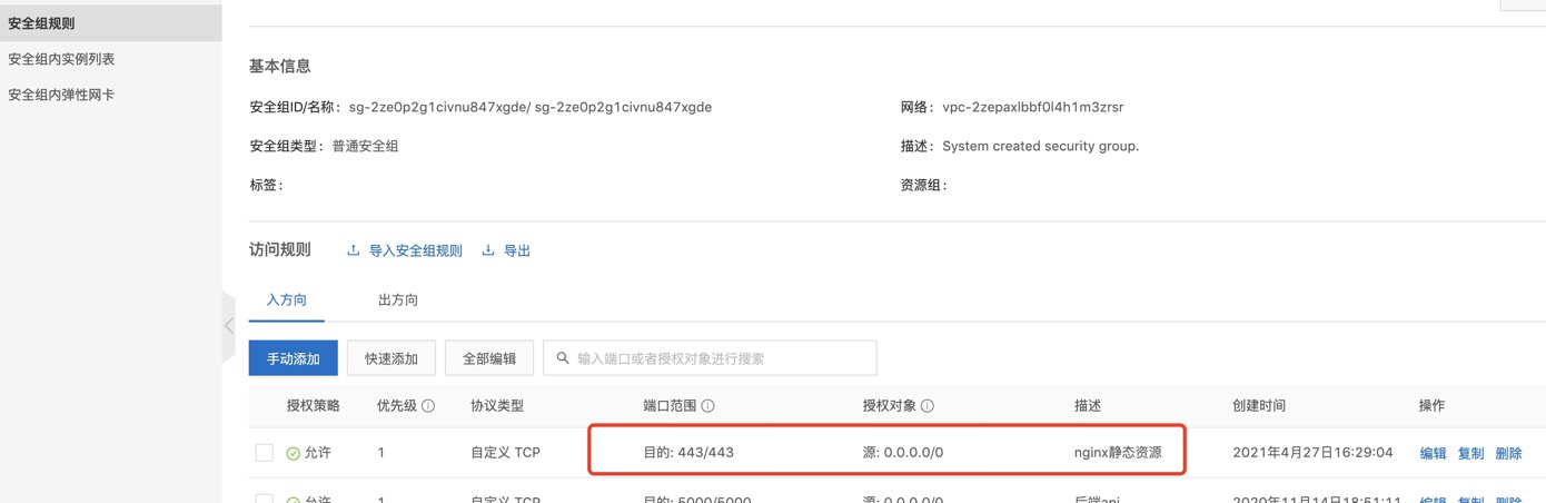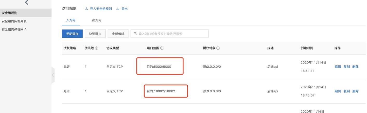 - 首先要在阿里云安群组规则 (opens new window)中添加后端api请求的端口号: