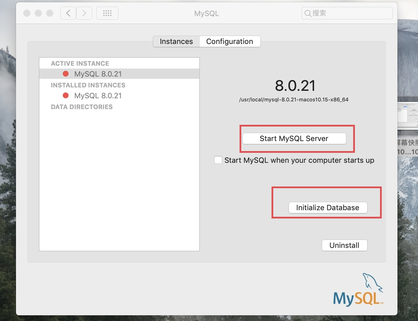 - 打开系统偏好设置,点击最下面的mysql,出来如下界面: