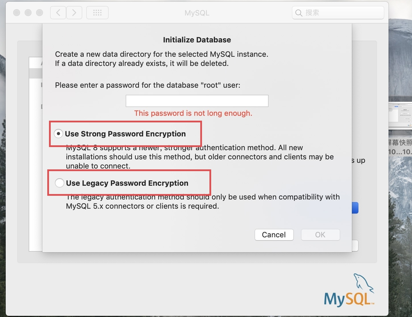 Strong Password有要求的,(mini length is 8 characters,and a fix of letter,number and other character),意思就是说,密码的最小的长度为8位,而且是字母,数字和其他字符的混合,一定要三者都包括(你输入的密码不符合要求,mysql安装时不会提醒,但是密码登陆时不会通过)