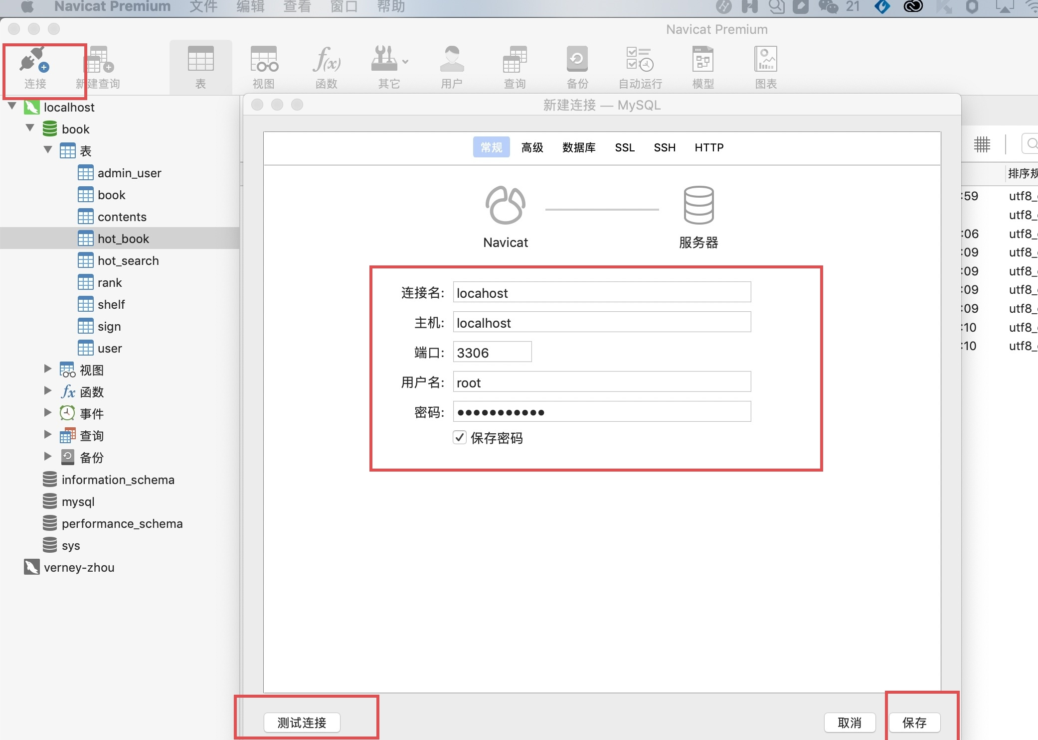 连接本地数据库,用户名:root;密码:输入的密码是在mySql里面设置的 Legacy password,输入完成先点击 测试连接,成功后,保存~