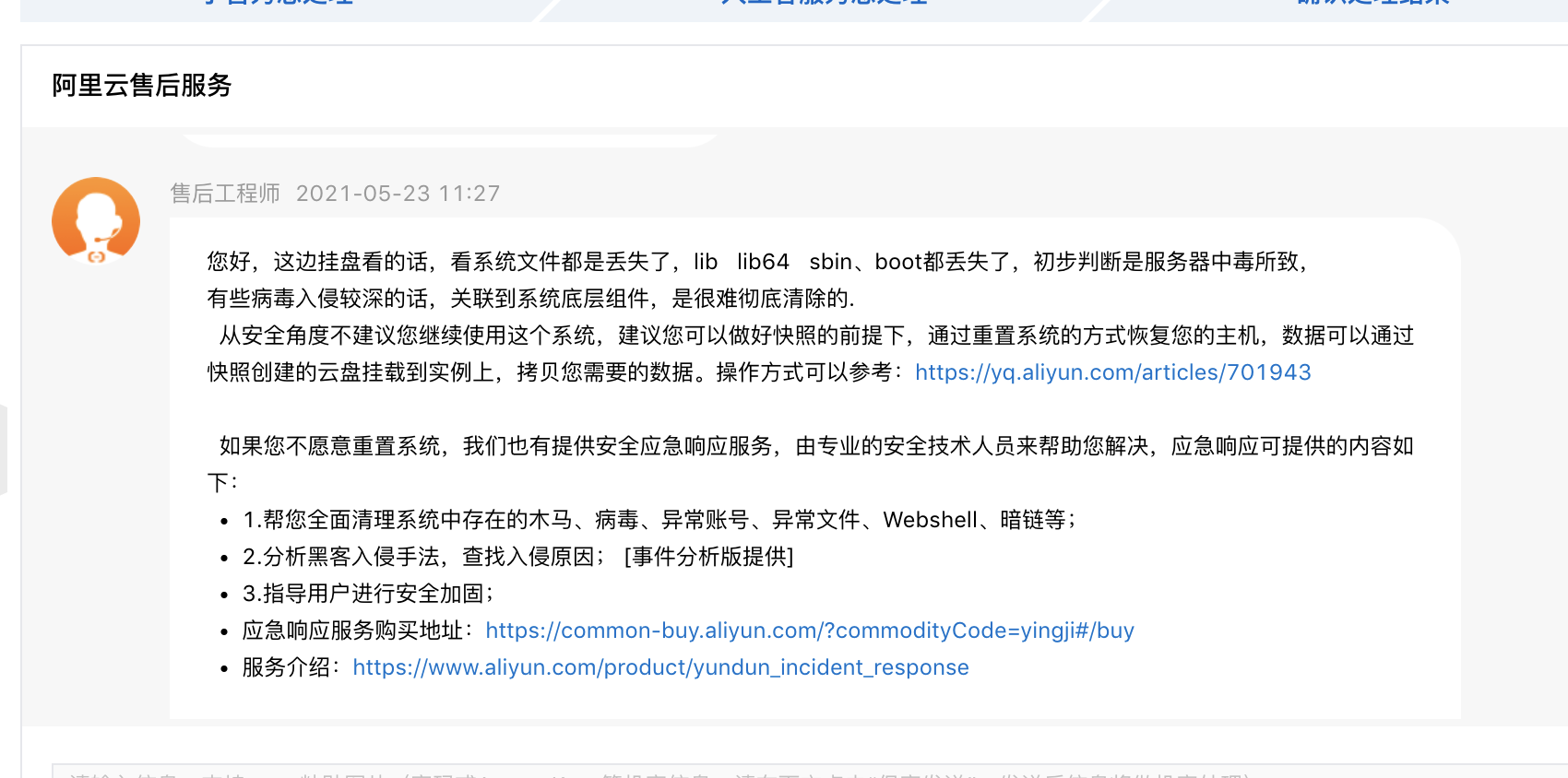 然后问题就搁置到周日了,最后实在没办法,给阿里云提了个工单,说了我的问题,响应倒是挺及时,夜里三点给我回复,只是当时我已经睡了~~~