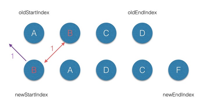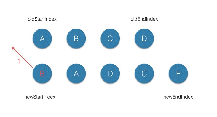 oldCh还是newCh的起始或者终止节点都不存在sameVnode,但节点属性中是带key标记的, 然后在oldKeyToIndx中找到对应的节点,这样第一轮diff过后oldCh上的B节点被删除了,但是newCh上的B节点上elm属性保持对oldCh上 B节点 的elm引用。