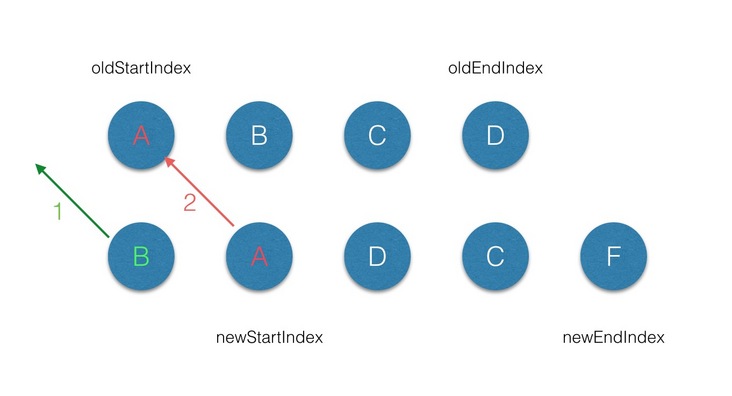 oldCh还是newCh的起始或者终止节点都不存在sameVnode,同时节点属性中是不带key标记的,因此第一轮的diff完后,newCh的startVnode被添加到oldStartVnode的前面,同时newStartIndex前移一位;