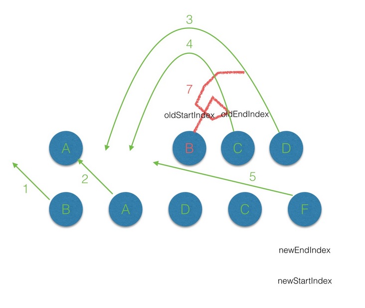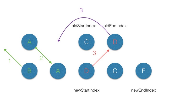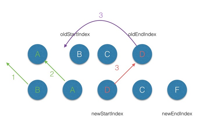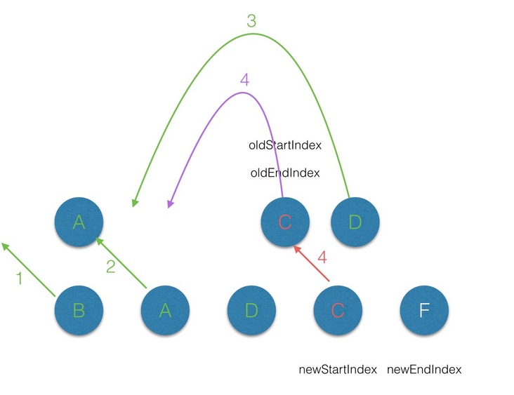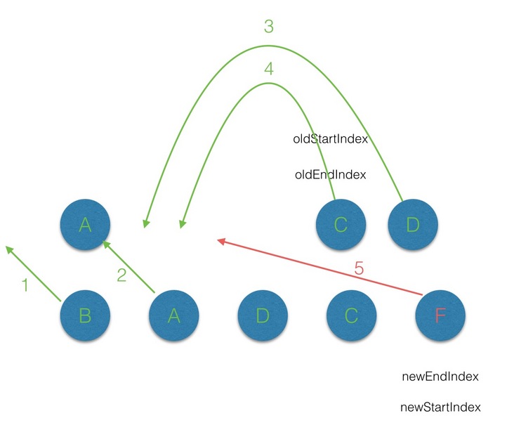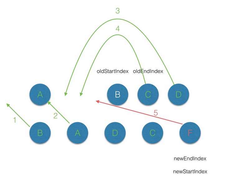 上面代码略显复杂,其实这里用到的是一种叫做首尾指针法的对比方法,新的子节点集合和旧的子节点集合,各有首尾两个指针。