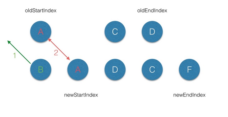 diff中,满足sameVnode(oldStartVnode, newStartVnode),因此对这2个vnode进行diff,最后将patch打到oldStartVnode上,同时oldStartVnode和newStartIndex都向前移动一位;