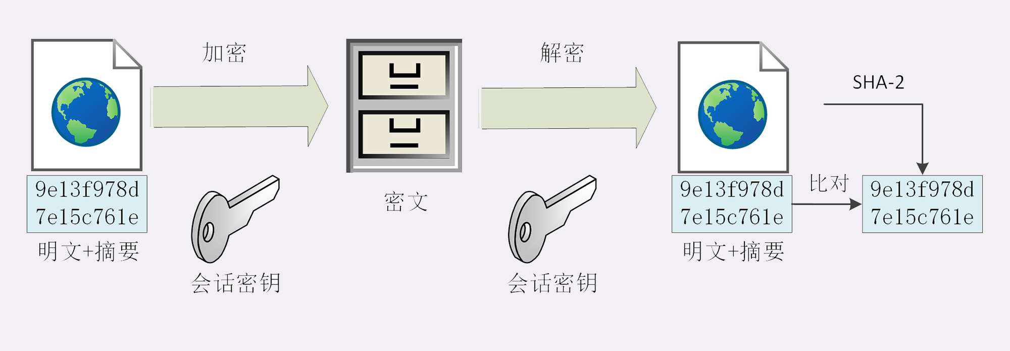 摘要算法对输入具有“单向性”和“雪崩效应”,输入的微小不同会导致输出的剧烈变化,所以也被 TLS 用来生成伪随机数(PRF,pseudo random function)。如果黑客在中间哪怕改动了一个标点符号,摘要也会完全不同,网站计算比对就会发现消息被窜改,是不可信的。