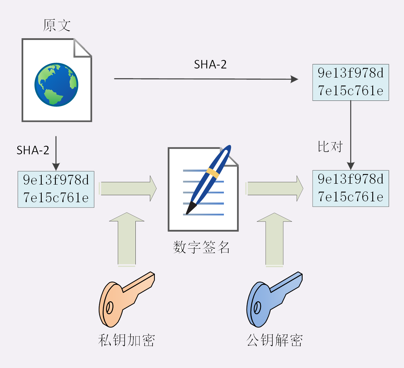 但又因为非对称加密效率太低,所以私钥只加密原文的摘要,这样运算量就小的多,而且得到的数字签名也很小,方便保管和传输。