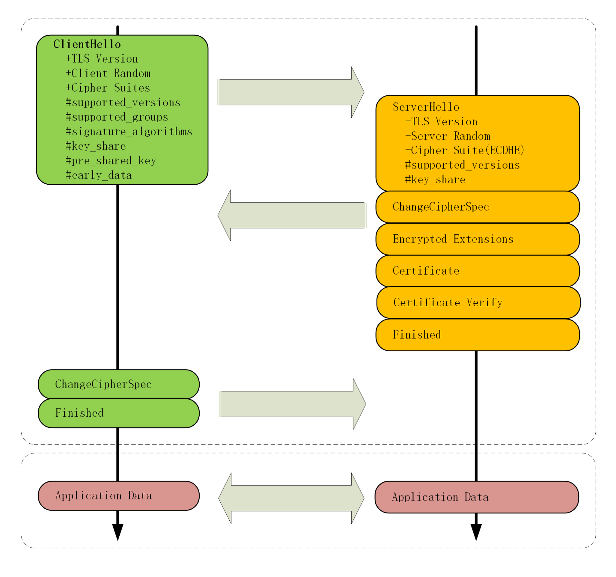 - 为了兼容 1.1、1.2 等“老”协议,TLS1.3 会“伪装”成 TLS1.2,新特性在“扩展”里实现;
