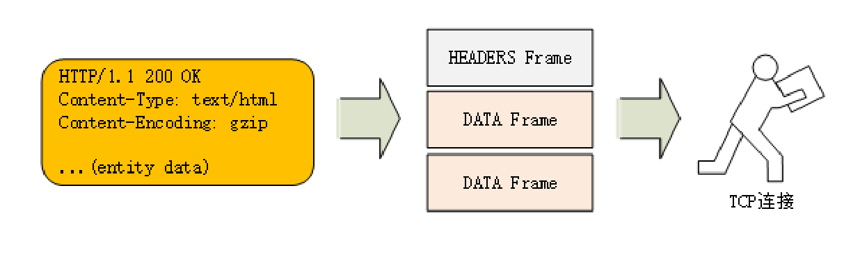 它把 TCP 协议的部分特性挪到了应用层,把原来的“Header+Body”的消息“打散”为数个小片的二进制“帧”(Frame),用 HEADERS帧存放头数据、DATA帧存放实体数据。