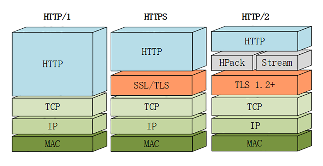 下面的这张图对比了 HTTP/1、HTTPS 和 HTTP/2 的协议栈: