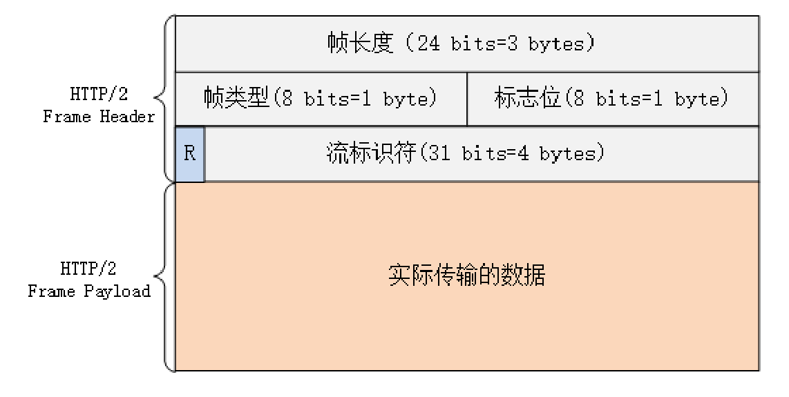HTTP/2 的帧结构有点类似 TCP 的段或者 TLS 里的记录,但报头很小,只有 9 字节,非常地节省。二进制的格式也保证了不会有歧义,而且使用位运算能够非常简单高效地解析。