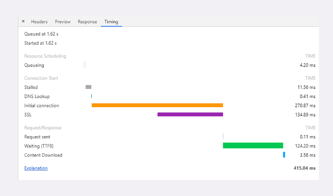 - 连接前必须要解析域名,这里因为有本地缓存,所以只消耗了 0.41 毫秒(DNS Lookup);