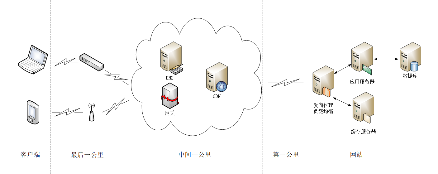 - 第一公里 是指网站的出口,也就是服务器接入互联网的传输线路,它的带宽直接决定了网站对外的服务能力,也就是吞吐量等指标。显然,优化性能应该在这“第一公里”加大投入,尽量购买大带宽,接入更多的运营商网络。