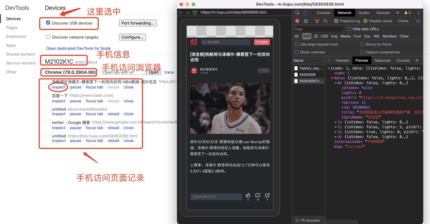 chrome://inspect,在Devices下面选中Discover USB devices;同时手机也打开Chrome浏览器,随便访问一个页面,即可在PC的页面上看到访问记录,如下图所示: