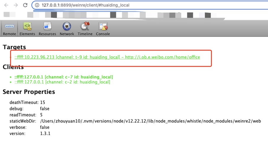 Whislte的顶部菜单Weinre中增加一条记录,点击它,会就开如下页面,手机访问i.ob.e.weibo.com,不出意外Targets下就会出现一条访问记录,代表连接成功,之后就可在这个页面查看手机访问时的各种信息了~