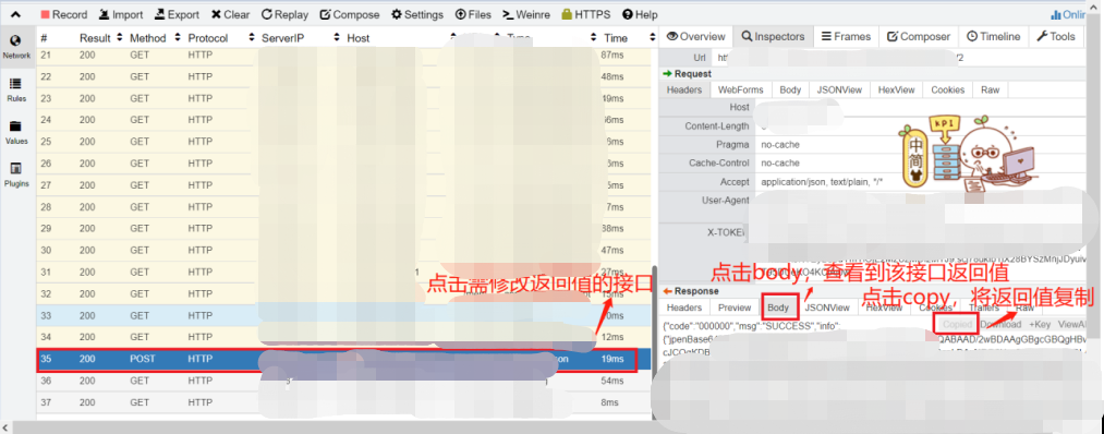 Network中找到需修改返回值的接口,点击该接口,点击右侧的response的body,可查看到该接口的返回值。点击copy,将返回值复制: