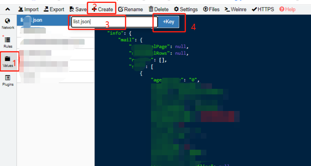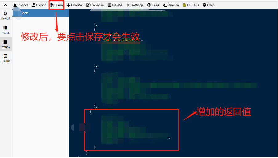 Values中新建一个json文件,将复制的内容黏贴到该文件中,修改参数为自己所需的接口返回(可新增/修改/删除返回值):