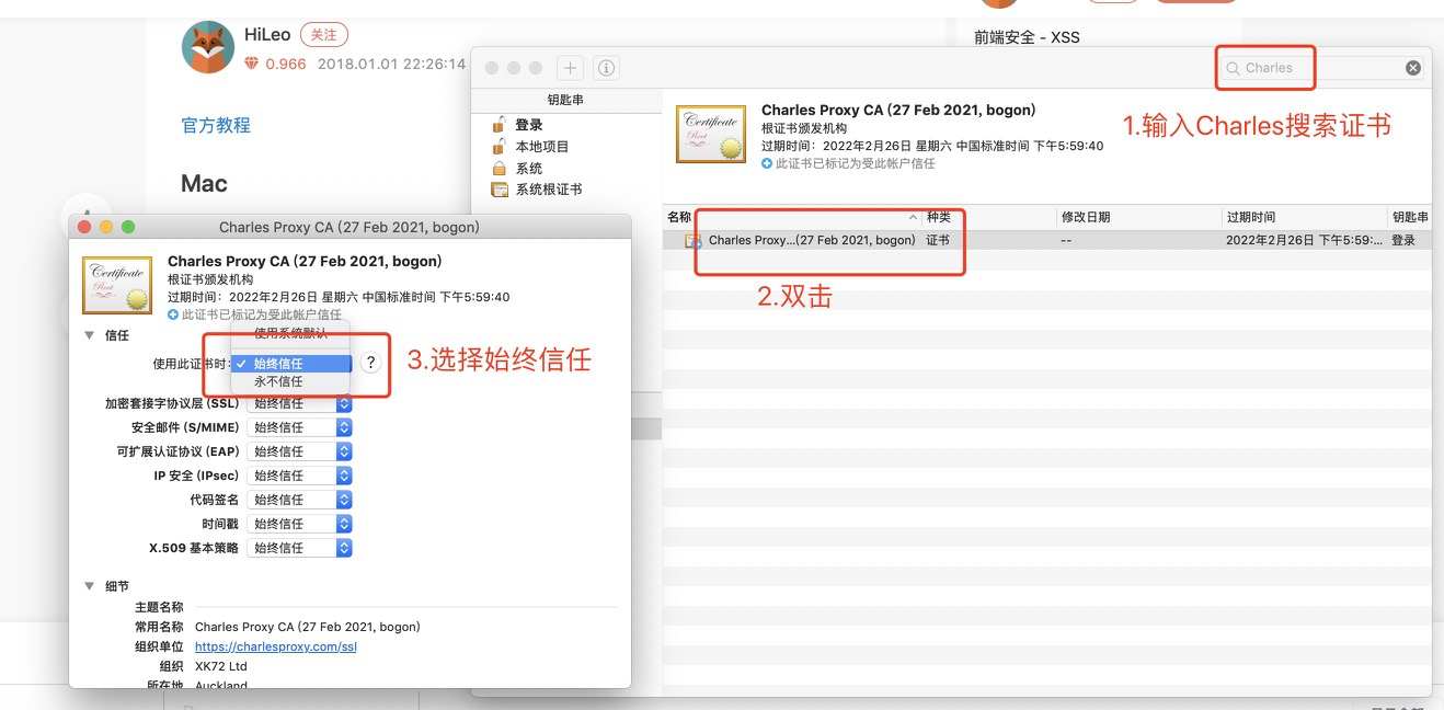 - 打开Charles > help > SSL Proxying > Install Charles Root Certifacate,进行添加;