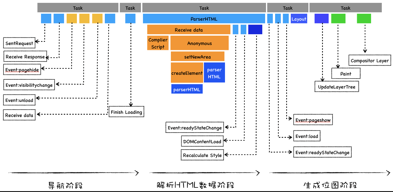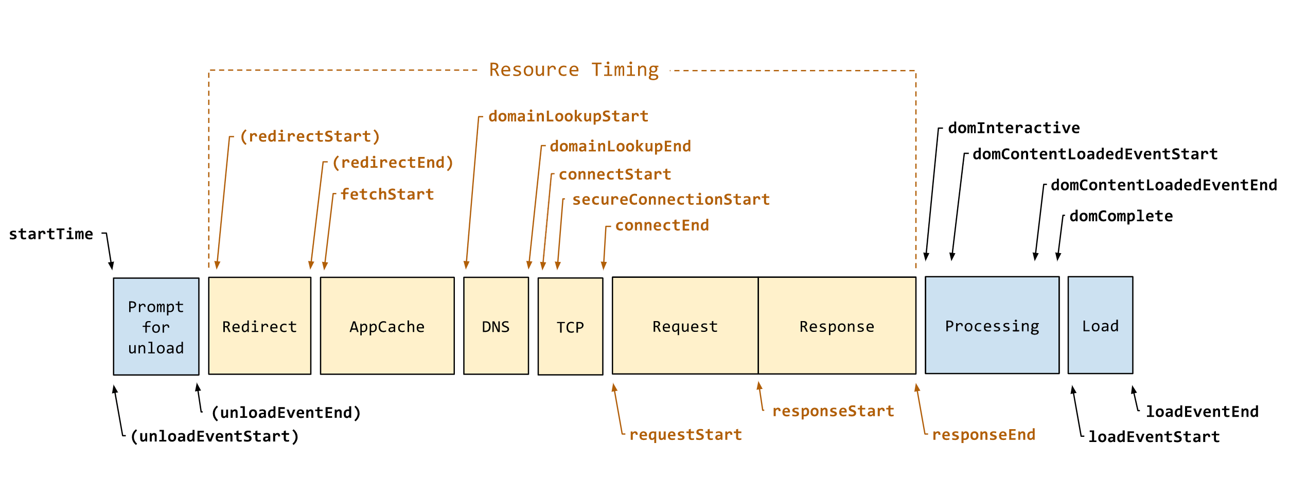 页面运行的时间线(统计了从浏览器从网址开始导航到 window.onload事件触发的一系列关键的时间点):