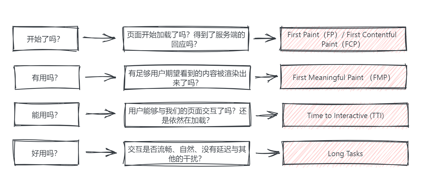 既然前端页面性能如此之重要,也是用户体验的核心衡量标准。我们想要让网站的性能提升,具体指的是什么?如何去量化我们的优化?而性能体验这种东西往往是相对的,所以在讨论性能时,我们需要有精确的数据,需要有可以测量的客观的标准来定义,这些标准就是网页性能指标。