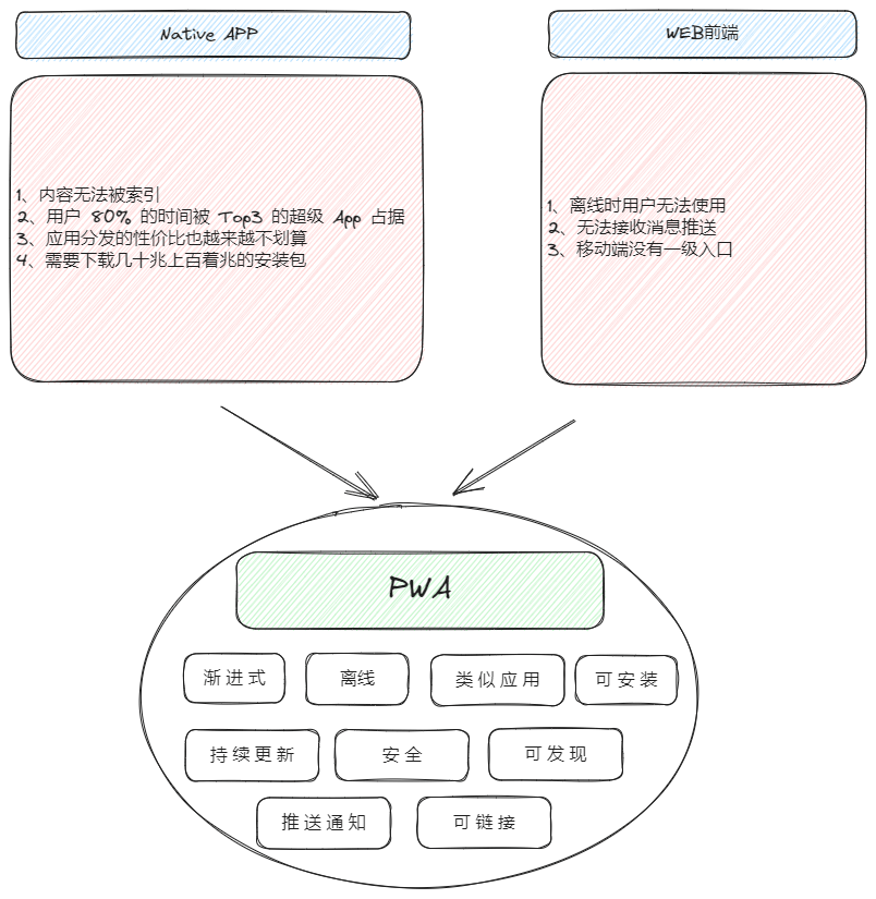 PWA的中文名叫做渐进式网页应用,它的诞生了是为了在用户体验和用户留存两方面提供了更好的解决方案,将 Web 和 App 各自的优势融合在一起:渐进式、可响应、可离线、实现类似 App 的交互、即时更新、安全、可以被搜索引擎检索、可推送、可安装、可链接。